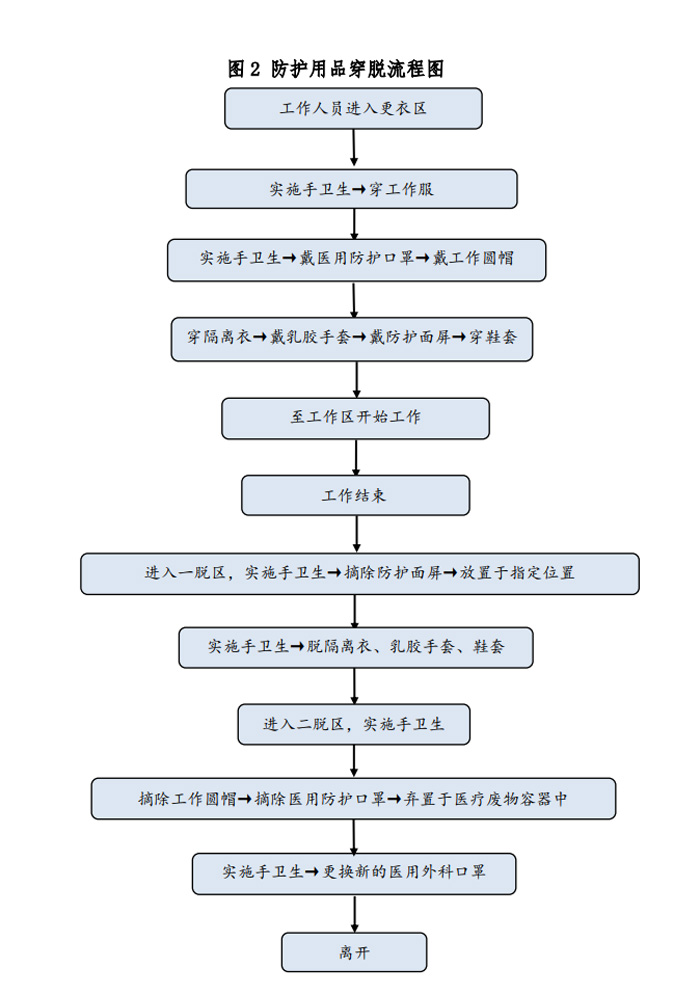 除X線電離防護(hù)外,方艙CT檢查需對操作技師、患者及家屬做相應(yīng)的防護(hù)。根據(jù)國家衛(wèi)生健康委辦公廳印發(fā)的《新型冠狀病毒肺炎防控方案》(第五版)[6]對于在新型冠狀病毒感染的肺炎疫情防控工作中不同的工作人員其防護(hù)等級是不同的。如是疑似患者,技師則執(zhí)行二級防護(hù)。方艙CT內(nèi),設(shè)置清潔區(qū)、一脫區(qū)、二脫區(qū)、免洗手消毒液、一次性防護(hù)服、一次性乳膠手套、鞋套、洗手液。技師需經(jīng)多次反復(fù)訓(xùn)練穿脫流程和檢查流程,并做好總結(jié),考察合格方可上崗。為此我科花費了大量時間進(jìn)行了防護(hù)用品穿脫,消殺,接診流程的演練,并做總結(jié)和改進(jìn)措施。(附件1所示),防護(hù)用品穿脫流程如圖2所示。