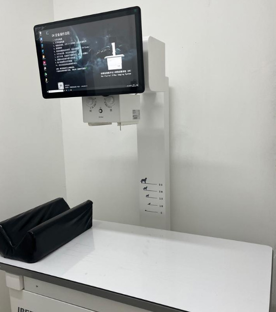 這就是寵物專用的寵物DR影像系統(tǒng),檢查設(shè)備非常重要??焖倥袛嗖∏镈R系統(tǒng)由于它成像快的優(yōu)點,現(xiàn)在已經(jīng)在寵物醫(yī)院廣泛的使用的儀器設(shè)備。都是比較有實力的寵物醫(yī)院。可以在動物動態(tài)情況下進(jìn)行DR攝片檢查。DR的作用在臨床中拍片子,可以看有沒骨折、有沒有膀胱石,有幾個胎兒等等,DR的手術(shù)床可以活動的方便我們中間去選位置,可以跟這個大小調(diào)整位置。鉛衣是做拍攝防護(hù)的,選擇拍攝部位,腿部、胸部、前肢等。不同部位的值也是不一樣的。千伏毫秒都不一樣。
